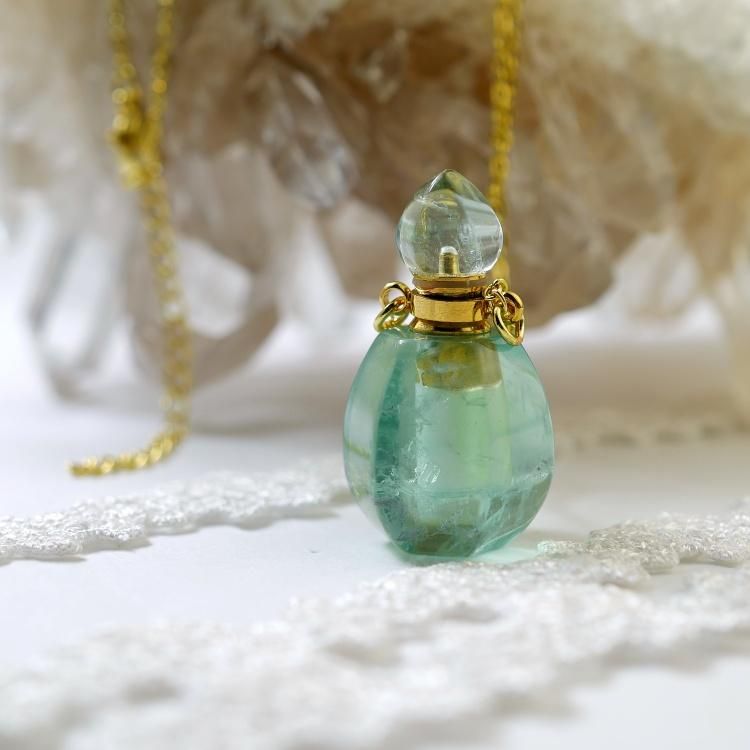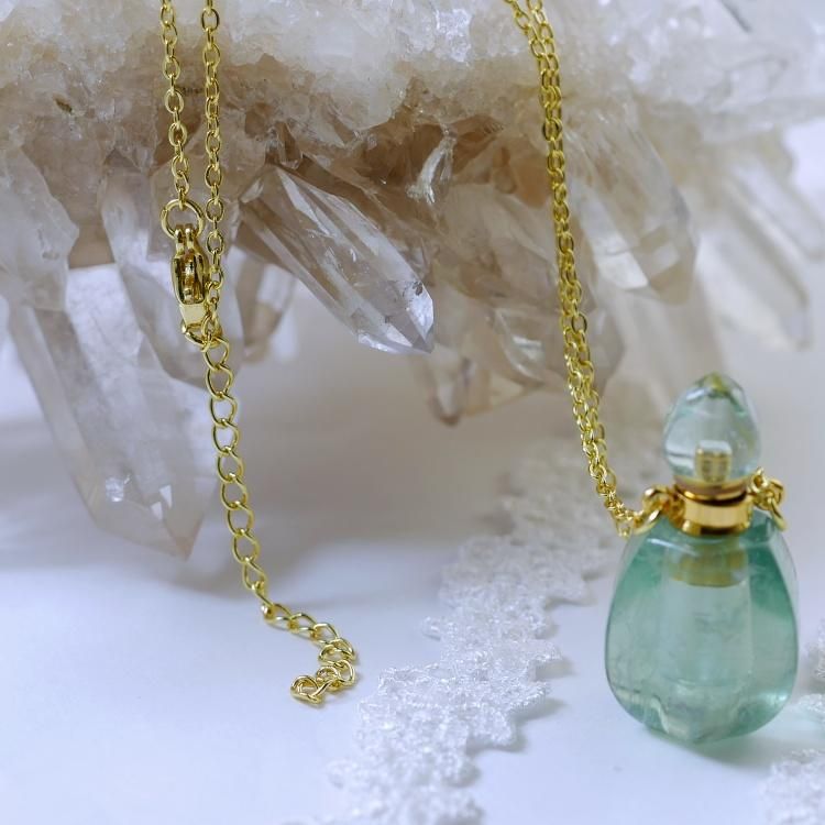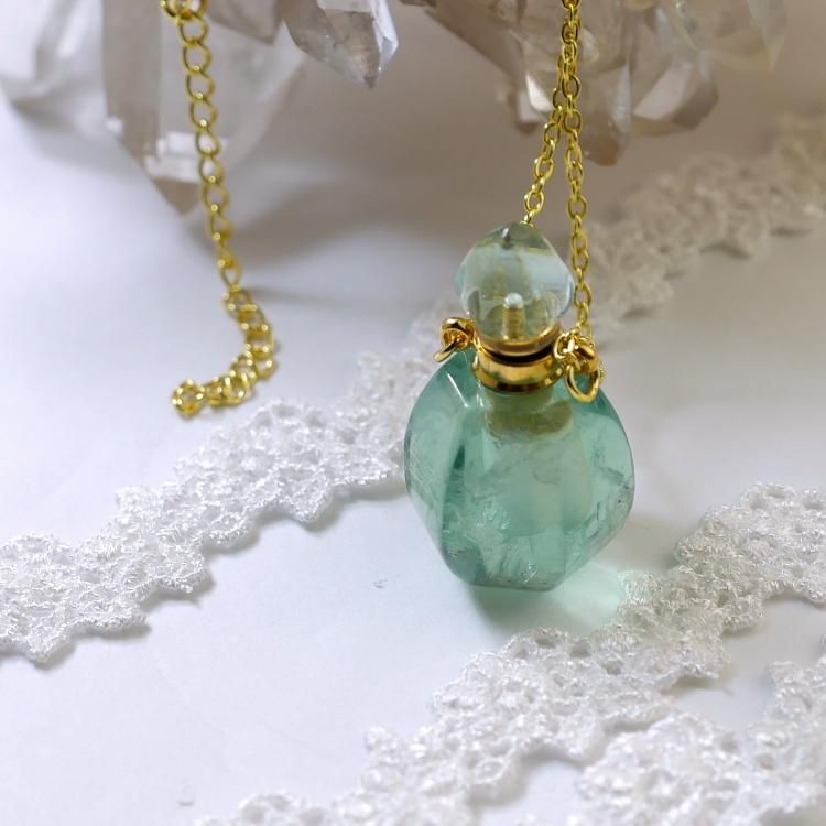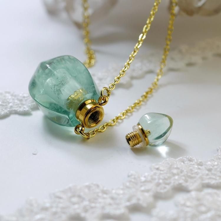 グリーンフローライトで作られた、アロマボトルのネックレスです。