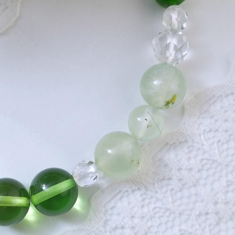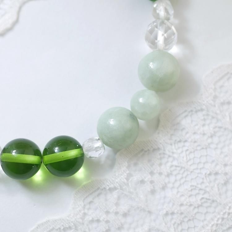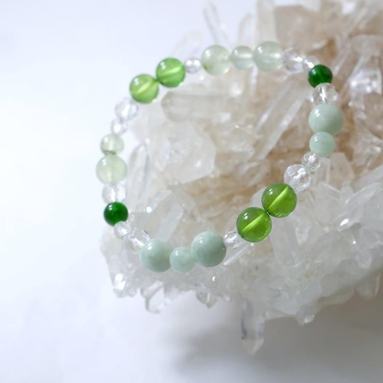 様々なことに快適と満足をもたらすグリーン色の石と水晶を使って、デザインブレスレットを作りました。